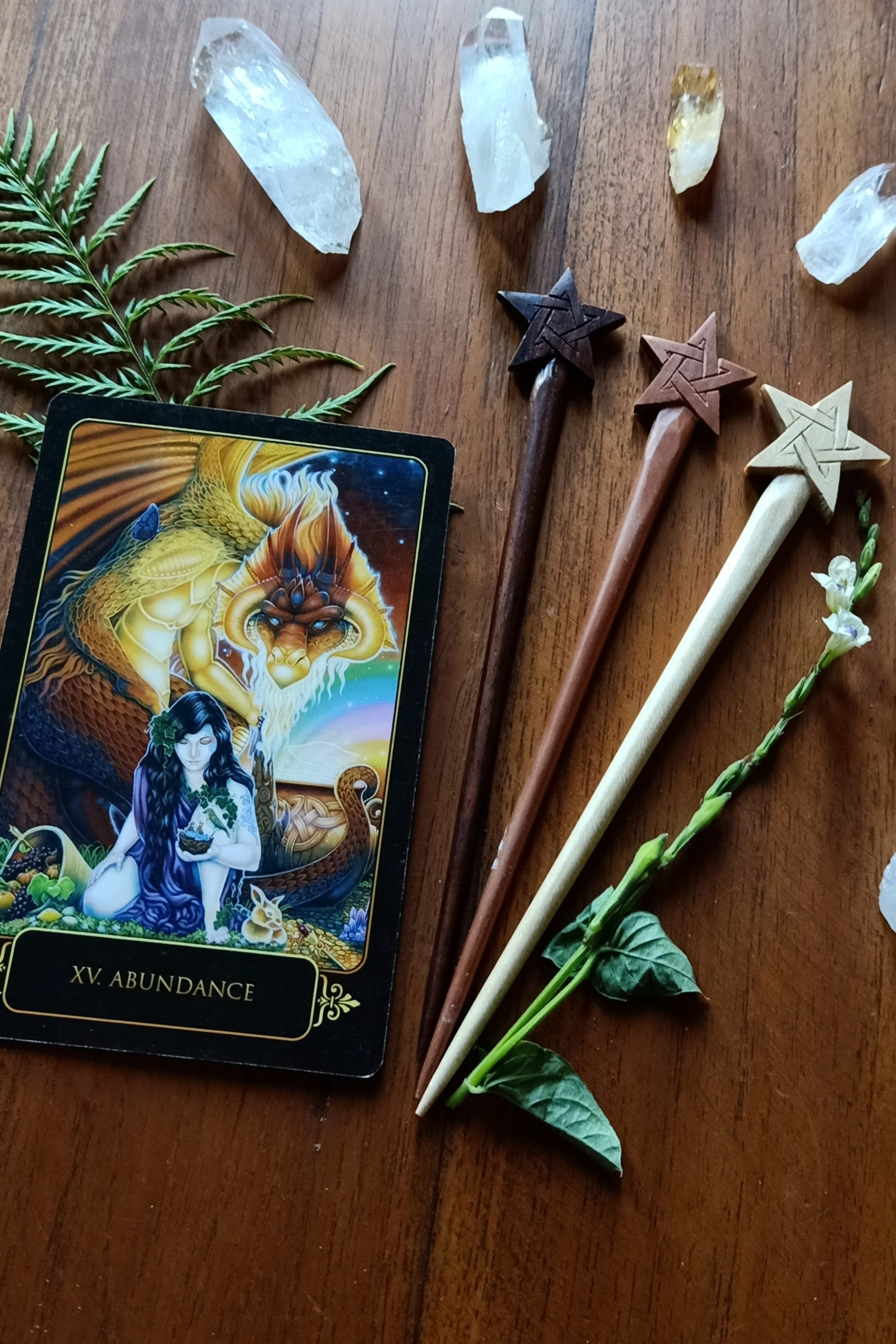 Handmade Wooden Star Hair Sticks intricately carved on both sides.