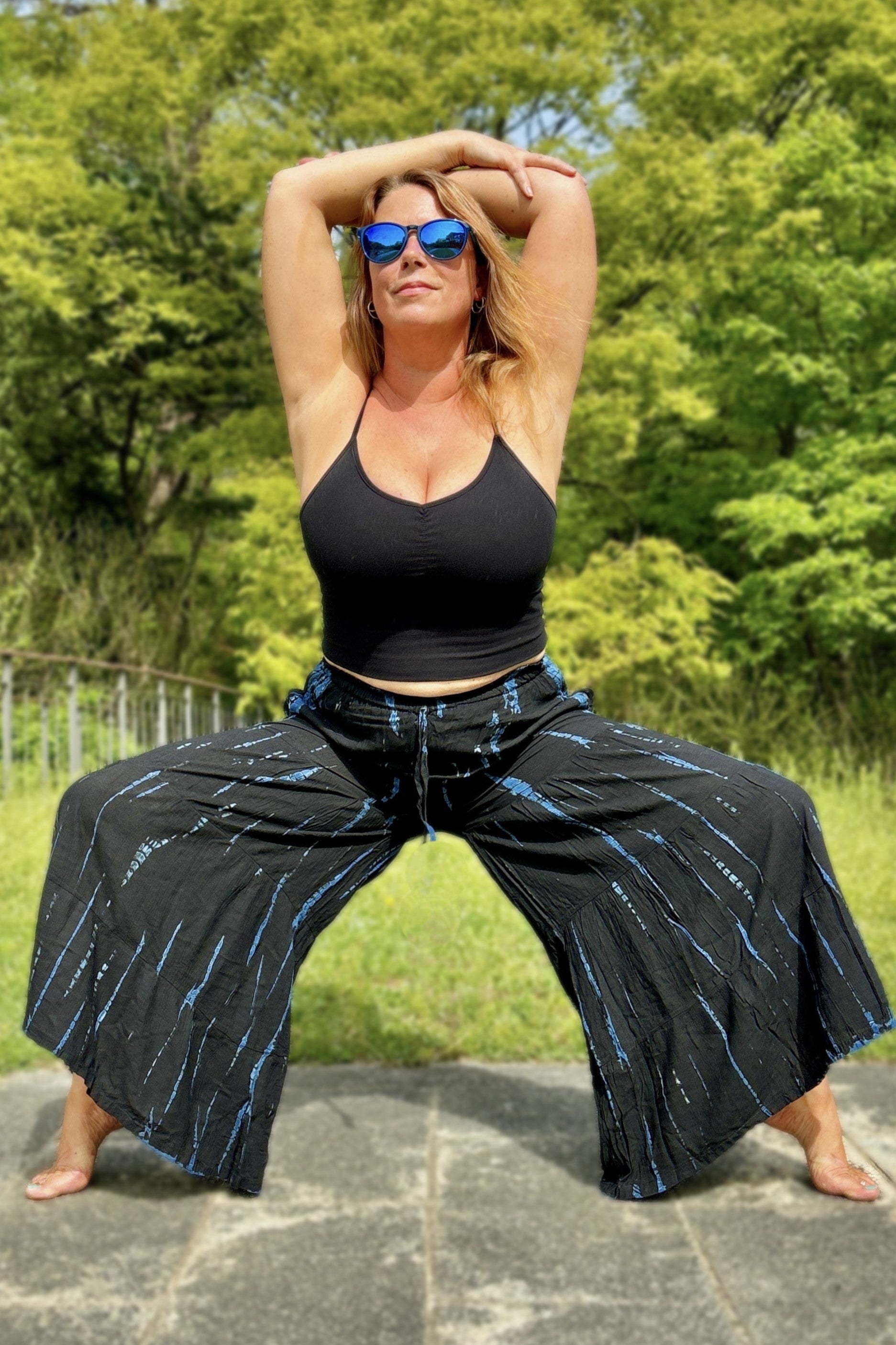 Hand tied and dyed, each pair have unique pattern, will be similar to photos, black with blue colored streaks. Made of 100% cellulose rayon fabric, they are silky, flowy and stunning. Matching tops in our Island Collection make gorgeous outfits.