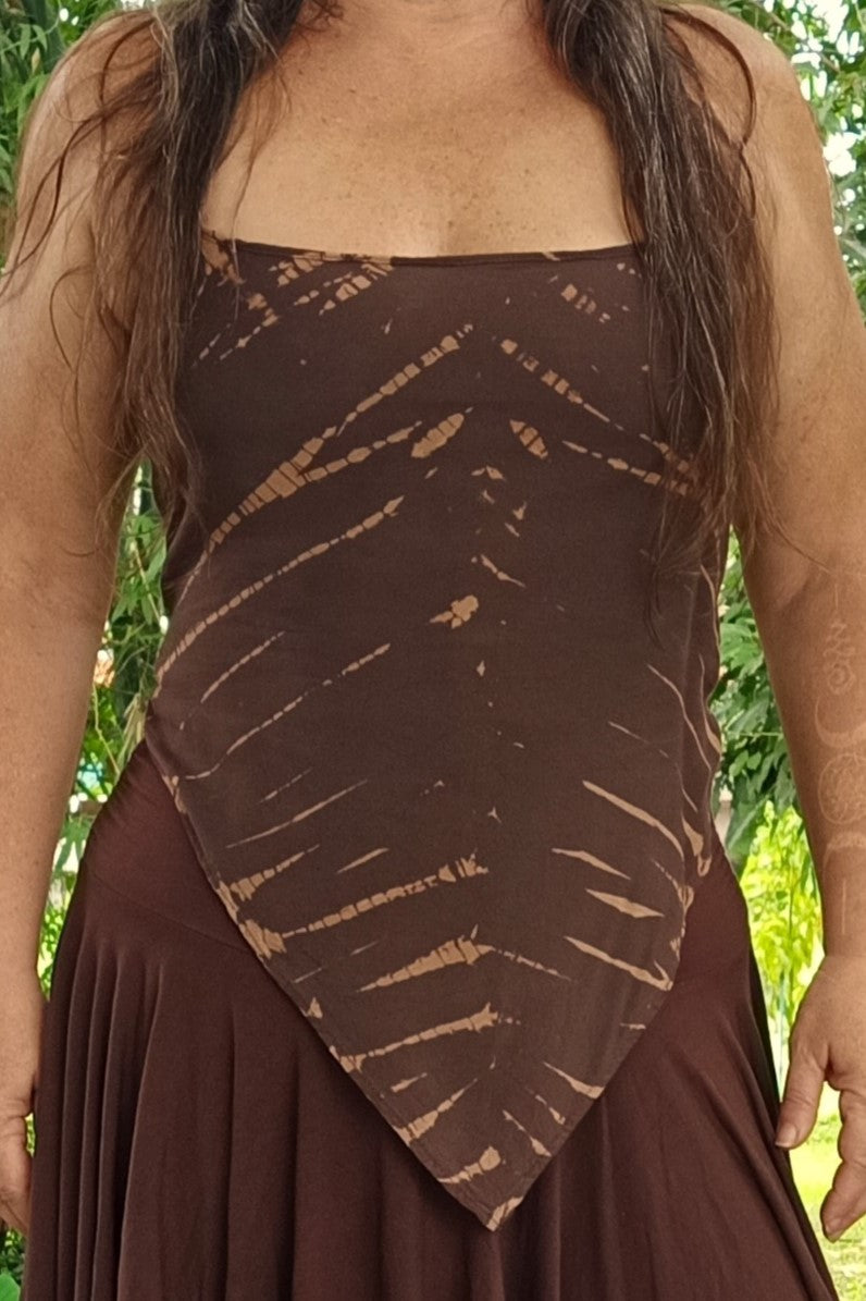Each one hand tied and dyed, will be similar to photos. Brown with beige tie dye streaks. Look great when paired with our Chocolate Pixie Skirt.